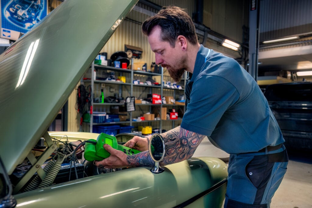 Kontrollen börjar med en visuell bedömning av batteriets fysiska skick. Eventuella skador är uppenbarligen ett allvarligt problem, men vår tekniker som utför batterikontrollen kommer också att vara noggrann med att inspektera polerna. Om de är korroderade på något sätt kan det betyda att strömkablarna inte kan få en god anslutning. I sådana fall är det vanligtvis bäst att byta batteri.